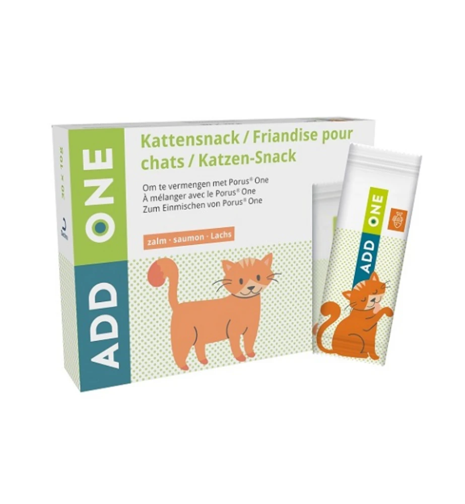 Add One Zalm is een lekkere snack voor katten in de vorm van een romige zalmsaus die rijks is aan vocht en Omega-3 vetzuren. De Add One Zalm is ook zeer geschikt voor het toedienen van de Porus One ter ondersteuning van de nieren. Add One bevat weinig calorieën, zelfs minder dan 10 kcal per stick. Deze kattensnacks bevatten geen toegevoegde suiker, kleur- of smaakstoffen en geen conserveermiddelen.