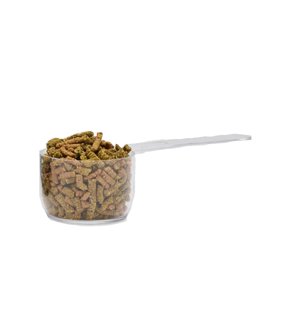 - 18 -24 maanden – Voedergewassen + granen + verwerkt voer: 2 maatschepjes per dag.