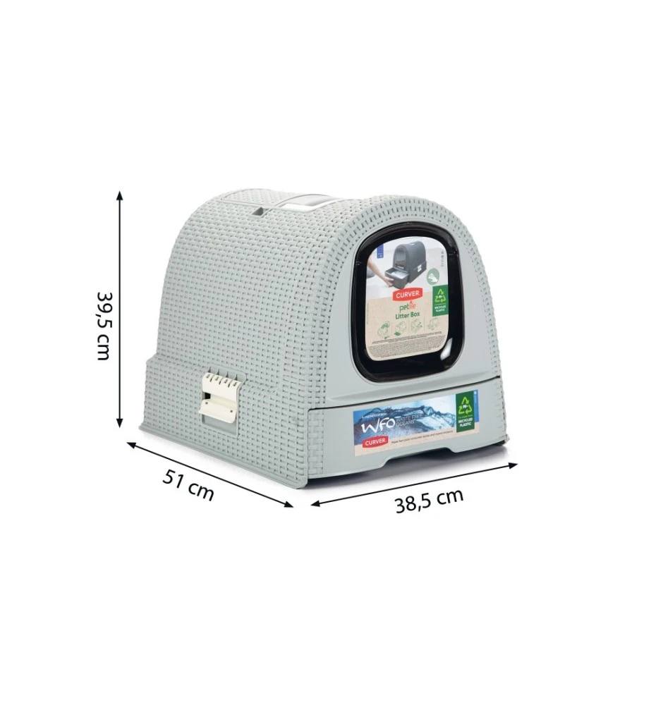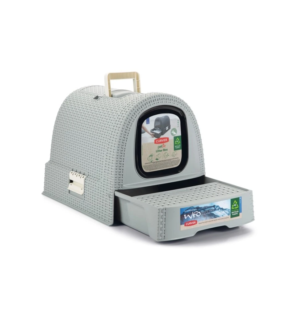 De Curver kattenbak heeft een modieuze uitstraling doordat het een motief heeft van gevlochten rattan. De lade aan de voorkant heeft een plateau met gaatjes, waardoor de kat een groot deel van het kattenbakgrit achterlaat in de bak alvorens de kattenbak te verlaten. Door de uitschuifbare lade kan je in een oogopslag zien of de kattenbak aan verschoning toe is. Aan de bovenkant van de kattenbak bevindt zich een klepje waar de kattenbakschep opgeborgen kan worden.