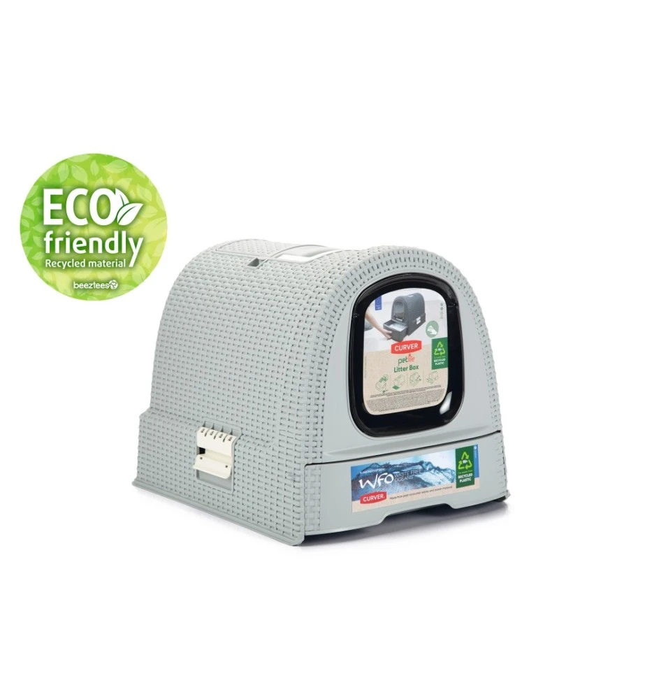 De Curver Kattenbak bestaat voor 95% uit gerecycled materiaal (huishoudelijk plastic afval en oude visnetten op de bodem van de zee (ocean waste)). De hele kattenbak is op zijn beurt ook weer 100% recyclebaar.