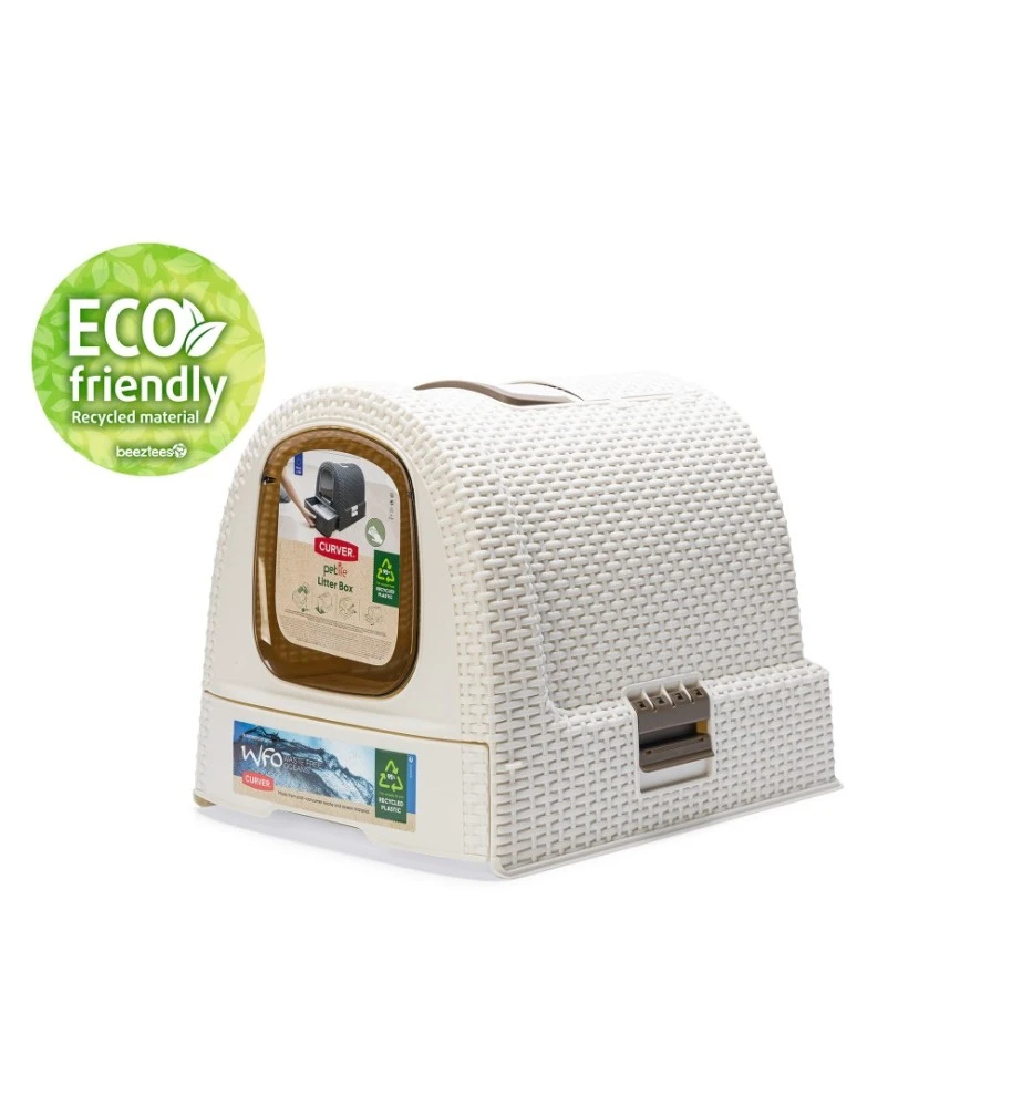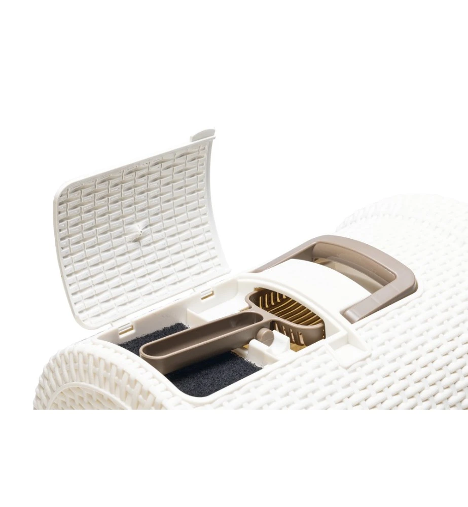 De Curver kattenbak heeft een modieuze uitstraling doordat het een motief heeft van gevlochten rattan. De lade aan de voorkant heeft een plateau met gaatjes, waardoor de kat een groot deel van het kattenbakgrit achterlaat in de bak alvorens de kattenbak te verlaten. Door de uitschuifbare lade kan je in een oogopslag zien of de kattenbak aan verschoning toe is. Aan de bovenkant van de kattenbak bevindt zich een klepje waar de kattenbakschep opgeborgen kan worden.