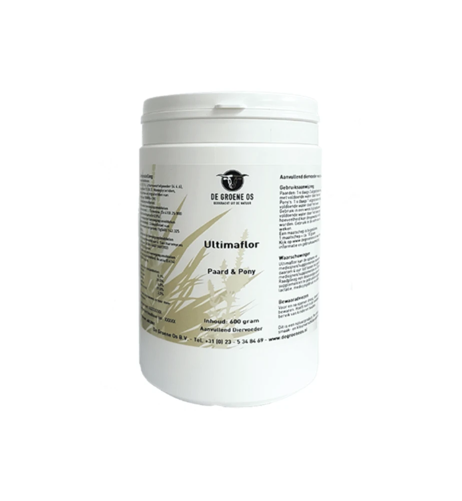 De Groene Os Ultimaflor is een probioticamiddel dat gaat verder waar veel andere middelen stoppen: de darmen hebben namelijk niet alleen probiotica nodig, maar ook aanvullende stoffen die het darmmilieu ondersteunen. Er zijn geen onnodige toevoegingen gedaan zoals maltodextrine, geur-, kleur-, of smaakstoffen. Ieder mens en dier heeft een eigen unieke microbioom. Daarom richt De Groene Os Ultimaflor zich niet alleen op het aanvullen van de goede darmbacteriën, maar ook op het creëren van de optimale omstandigheden voor een goede darmgezondheid waardoor de eigen flora zich kan ontwikkelen.