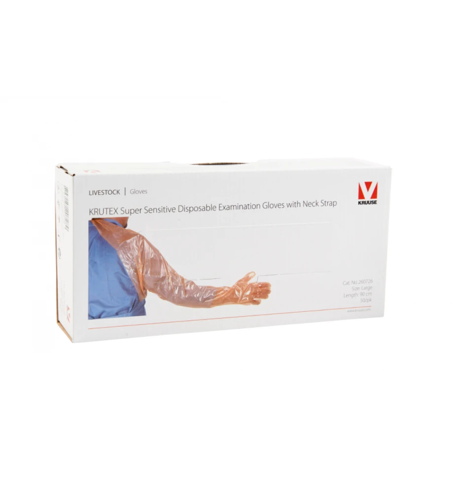 Extra lange sensitive handschoenen van de fabrikant Kruuse voor rectaal onderzoek bij landbouwdieren zoals runderen en paarden. De handschoenen zijn 90 cm lang en kunnen doormiddel van een neckstrap aan het lichaam vastgemaakt worden.